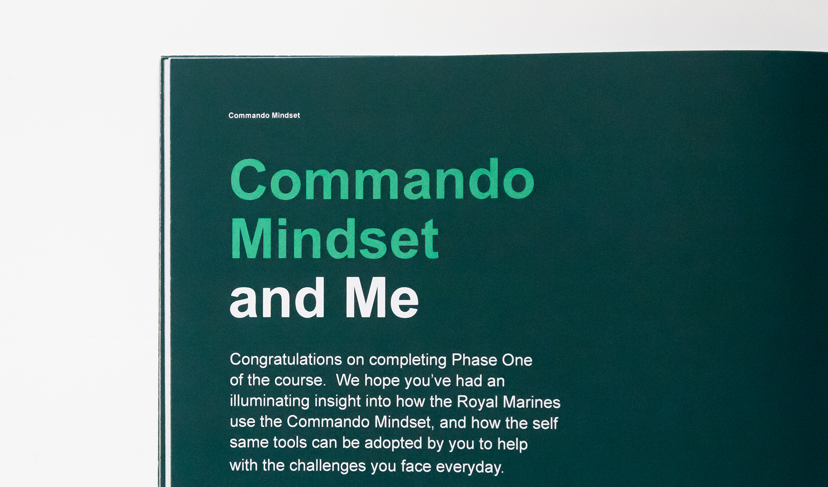 Our challenge was to get the idea into a shape so that people in other large scale organisations and businesses could harness it to tackle the ups and downs in their own stressful working lives. We worked with veterans Jon White and Joe Winch to define and build a step by step, how-to methodology which we then captured in a dynamic design and iconographical format. Jon and Joe also helped us create films of their own astonishing stories and the ways the Commando Mindset helped them through.